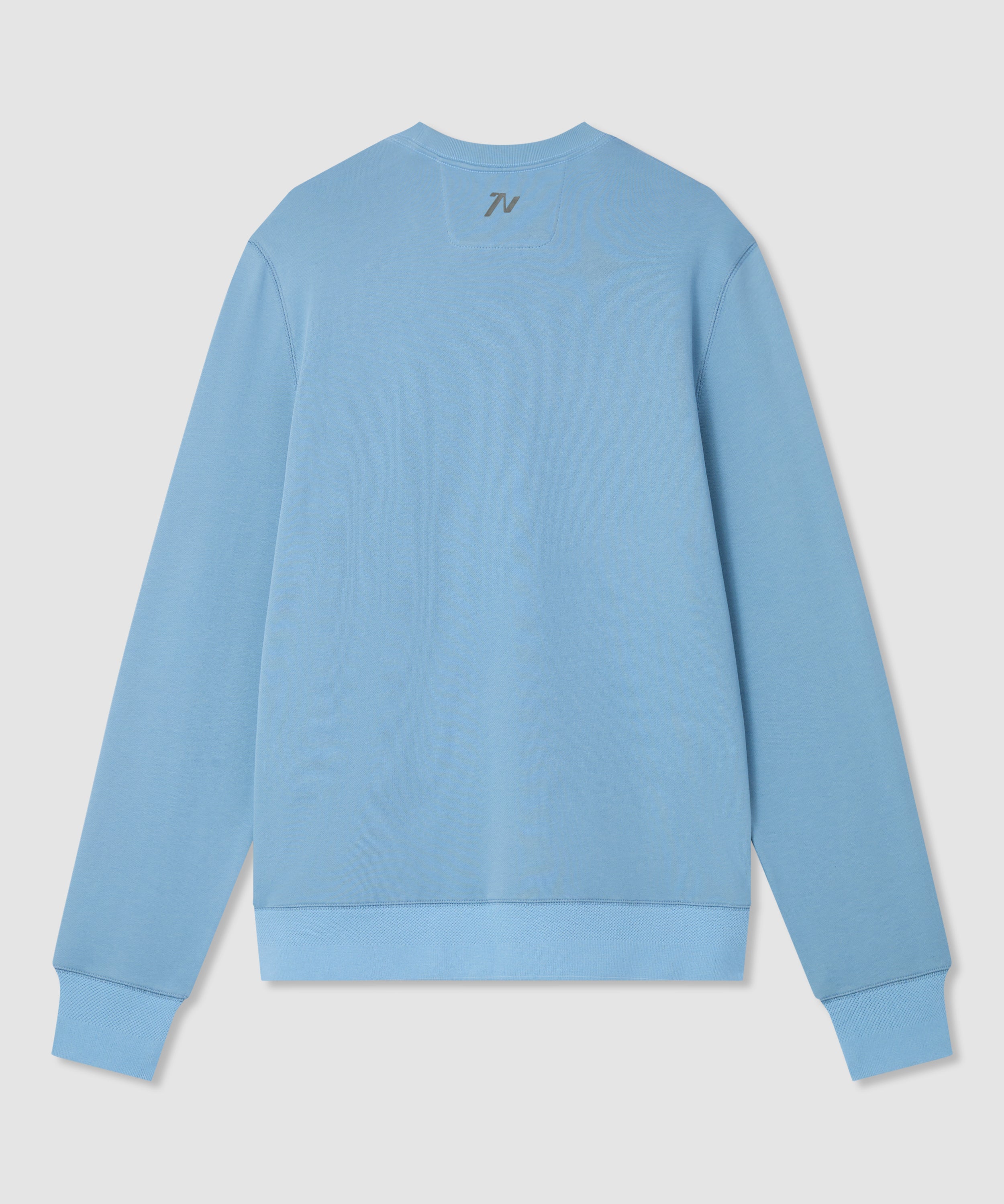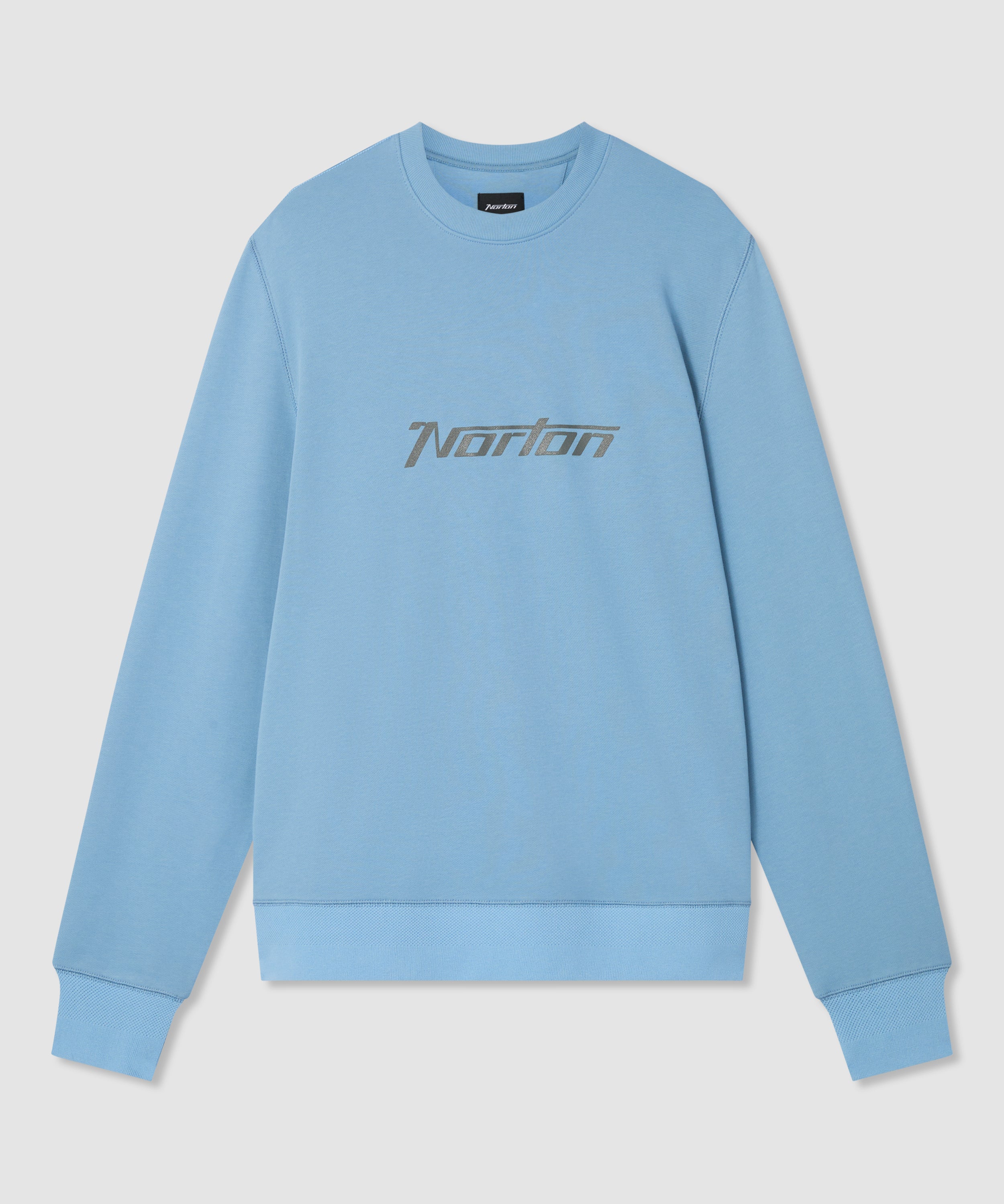 Ein blaues Jersey-Sweatshirt mit Rundhalsausschnitt für Herren, mit einem im Siebdruck aufgebrachten Norton-Logo auf der Brust. Dezente Norton-Details setzen einen stillen Akzent und vollenden ein Modell, das auf Klarheit statt Überfluss setzt.
