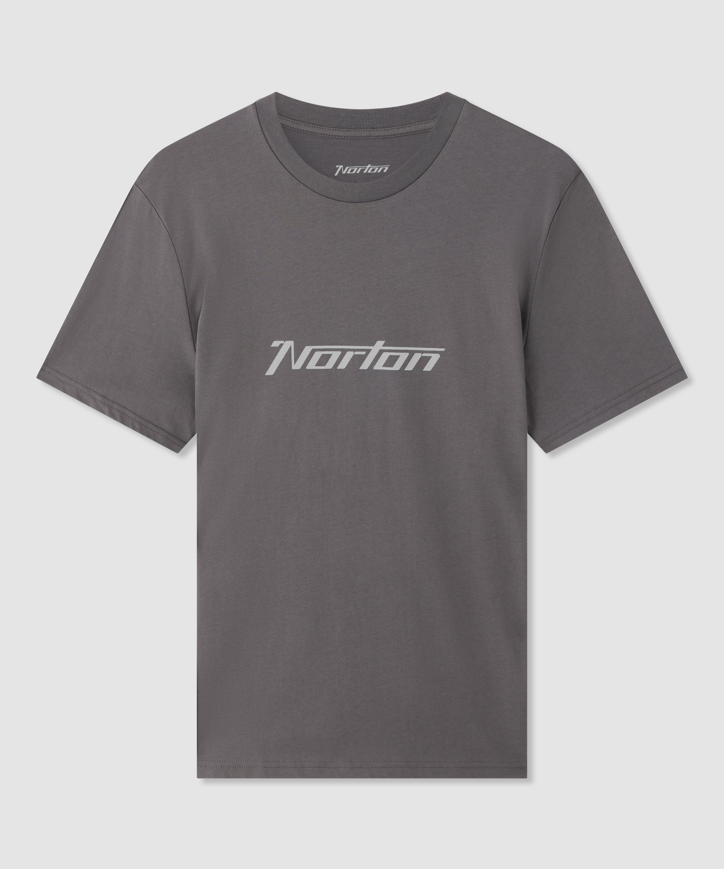 Made from 100% organic cotton, this grey mid weight, short sleeved jersey T-shirt features a black printed 'Norton' logo on the front chest.